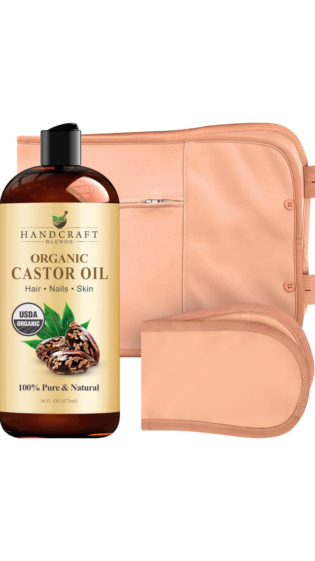 Handcraft BlendsOrganic cold-pressed castor oil with adjustable reusable wraps for stomach & neck therapy. |